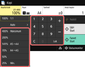 Vælg et fast kopiforhold fra listen, eller indtast et brugerdefineret forhold ved hjælp af de numeriske taster, og tryk derefter på [Luk].