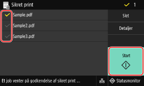 Vælg afkrydsningsfeltet for de sikre data, der skal udskrives, og tryk på [Start].