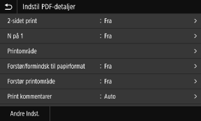 For at få vist skærmen skal du trykke på [Indstil PDF-detaljer] på indstillingsskærmen for udskrivning fra hukommelsesmedier.