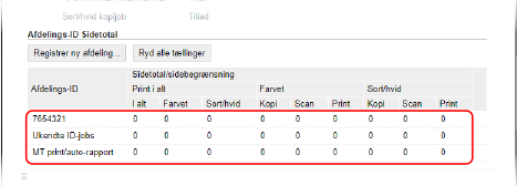 Du kan se antallet af sider, der er udskrevet og kopieret for hvert afdelings-id, når administrering af afdelings-id er aktiveret.
