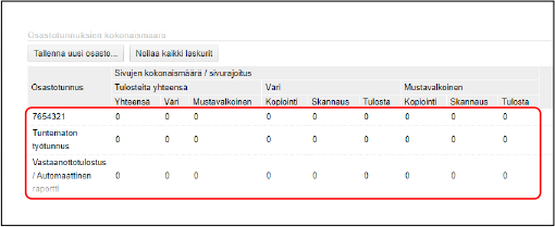 Voit tarkastella kullakin osastotunnuksella tulostettujen ja kopioitujen sivujen määrää, kun osastotunnusten hallinta on käytössä.