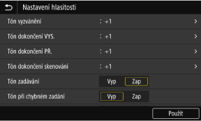 [Tón vyzvánění], [Tón dokončení VYS.], [Tón dokončení PŘ.], [Tón dokončení skenování] (Pro modely s funkcí faxu)