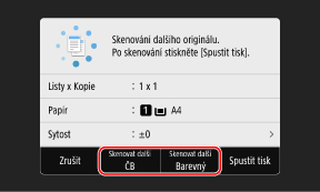 Pro každý originál můžete vybrat barevný režim (ČB nebo Barevný). Chcete-li kopírovat další originál černobíle, stiskněte tlačítko [Skenovat další ČB]. Chcete-li kopírovat barevně, stiskněte tlačítko [Skenovat další Barevný].