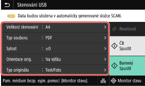Pokud se zobrazí obrazovka ovládání paměťového média, stiskněte [Skenování USB] a pokračujte krokem 5.