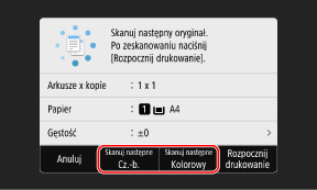 Możesz wybrać tryb koloru (czarno-biały lub kolorowy) dla każdego oryginału. Aby skopiować następny oryginał w trybie czarno-białym, naciśnij [Skanuj następne Cz.-b.]. Aby kopiować w kolorze, naciśnij [Skanuj następne Kolorowy].
