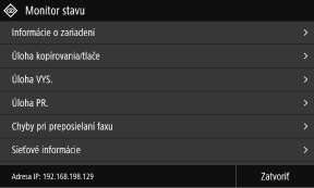 Táto obrazovka sa zobrazí, keď stlačíte tlačidlo [Monitor stavu] na obrazovke [Domov] a na iných miestach. Pomocou tejto obrazovky môžete skontrolovať informácie o zariadení, použitie a výpisy, nastavenia siete a informácie o chybách. Obrazovka [Monitor stavu]