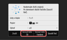 Pre každý originál môžete zvoliť farebný režim (čiernobielo alebo farebne). Ak chcete použiť čiernobiele kopírovanie ďalšieho originálu, stlačte tlačidlo [Skenovať ďalšie ČB]. Ak chcete vykonať farebné kopírovanie, stlačte [Skenovať ďalšie Farebné].