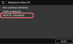 Po zobrazení hlásenia [Nastavenia sú nakonfigurované.] sa zobrazí obrazovka [Nastavenia režimu PR.].