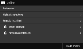 ]. Pēc noklusējuma ekrāns [Sākums] tiek parādīts pēc iekārtas ieslēgšanas un uzreiz pēc sākšanas ekrāna aizvēršanas, un uzreiz pēc pieteikšanās. Ekrāns [Sākums]