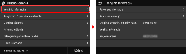 Elementą galima pasirinkti paliečiant elemento pavadinimą ar mygtuką. Bus parodytas pasirinktas ekranas arba atliekama pasirinkta funkcija.