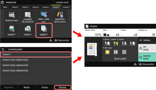 Te saate kuvada registreeritud sätteid kiiresti kasutamiseks juhtpaneeli kuvale [Avamenüü] ja iga funktsiooni kuvale lisatud otsetee nuppudega. Samuti saate sätteid pärast nende kuvamist vastavalt vajadusele muuta.