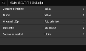 Kuva avamiseks vajutage [Määra JPEG/TIFF-i ük.] funktsiooni Memory Media Print sätete kuval.