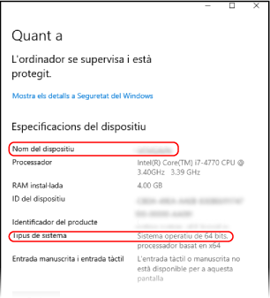 Si l'ordinador té un sistema operatiu de 64 bits, apareix "Sistema operatiu de 64 bits".