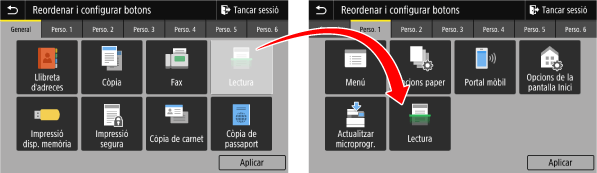 Podeu reordenar els botons de la pantalla [Inici] i moure els botons a altres pestanyes.