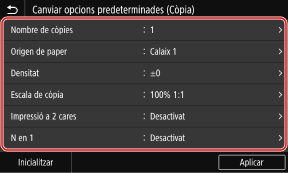 Podeu canviar les opcions predeterminades per a la lectura, la còpia i altres funcions a les quals s'accedeix mitjançant el tauler d’operacions.