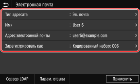 При использовании сервера LDAP, зарегистрируйте в аппарате сервер LDAP, на котором будет выполняться поиск адресатов. Регистрация серверов LDAP |