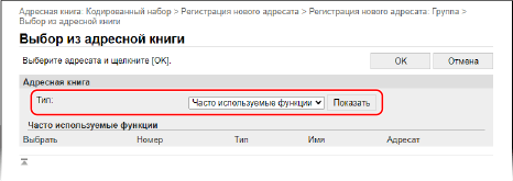 В [Тип] выберите [Часто используемые функции] или [Кодированный набор] и нажмите [Показать], чтобы изменить отображение адресной книги.