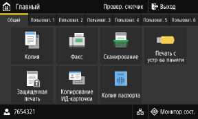 В верхней и нижней частях экрана постоянно отображается состояние аппарата и информация о входе в систему для быстрого просмотра и выполнения необходимых операций.