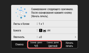 Если оригинал помещен на стекло экспонирования и его копирование выполняется в режиме 2-стороннего копирования или N на 1, отображается экран для сканирования следующего оригинала.