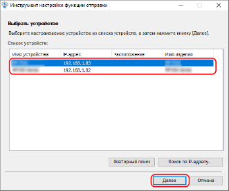 Из [Список устройств] выберите аппарат и щелкните [Далее].