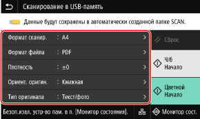 Вставка и извлечение запоминающего устройства USBЕсли открывается экран операций с запоминающими устройствами, нажмите [Сканирование в USB-память] и переходите к пункту 5.