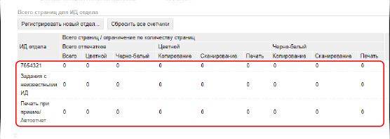 При использовании управления идентификаторами отделов можно посмотреть количество отпечатанных и скопированных страниц по каждому идентификатору отдела.