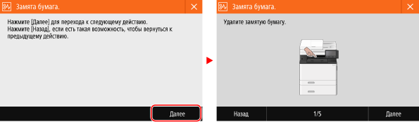 Если в аппарате застряла бумага, на панели управления появляется сообщение [Замята бумага.]. Нажмите [Далее] и следуйте отображаемым инструкциями по устранению застревания бумаги.
