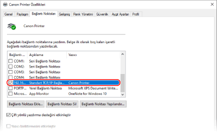 [Bağlantı Noktaları] sekmesinde, [Çift yönlü yazdırma desteğini etkinleştir] onay kutusunun işaretlendiğinden emin olun.