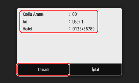 Tarama veya faks ekranında hedef belirtirken, hedef listesini kullanmaya ek olarak, bir hedef belirtmek için Kodlu Arama numarasını da girebilirsiniz.