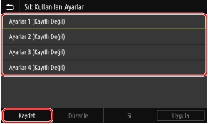 Favori Ayarlar'ı kaydetmek için işletim panelini kullanın. Bir bilgisayardan Uzak Kullanıcı Arabirimi'ni kullanarak Favori Ayarlar'ı kaydedemezsiniz.