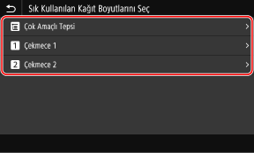 Kağıt ayarları ekranında, kaydedilen sık kullanılan kağıt boyutlarını görüntülenir. Kullanılmayan kağıt boyutları görüntüleniyorsa bunları her bir kağıt kaynağı için gizleyerek kağıt boyutu seçmeyi kolaylaştırabilirsiniz.