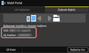 [Doğrudn Bağlntı] sekmesi üzerinde görüntülenen makine SSID'sini ve ağ anahtarını kontrol edin.
