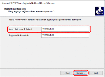 [Standart TCP/IP Yazıcı Bağlantı Noktası Ekleme Sihirbazı] ekranı görüntülenir.