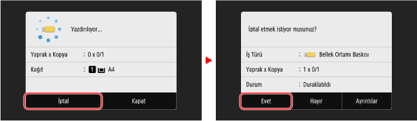 Bellek Ortamı Yazdırma kullanırken yazdırmayı iptal etmek için işletim panelini veya Uzak Kullanıcı Arabirimi'ni kullanın.