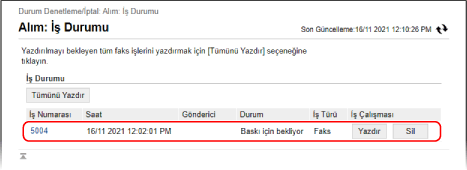 İş numarasına tıkladığınızda, [İş Detayları] ekranı görüntülenir. Alma zamanını ve sayfa sayısını görüntüleyebilir ve faksa önizleme yapabilirsiniz.