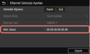 Makine kablolu LAN'a bağlıyken, makineye ayarlanan MAC adresini görüntüleyebilirsiniz.