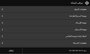 استخدم هذه الشاشة للتحقق من معلومات الجهاز والاستخدام والسجلات وإعدادات الشبكة ومعلومات الخطأ. يمكنك أيضًا استخدام هذه الشاشة لإزالة أجهزة ذاكرة USB من الجهاز.