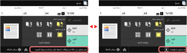 مسح الإعدادات تلقائيًابشكل افتراضي، في حالة عدم إجراء أي عمليات بعد فترة زمنية معينة، تُمسَح الإعدادات قيد التكوين على الشاشة، وتُعرض الشاشة [الرئيسية]. يمكنك تغيير الوقت الذي تُمسح فيه الإعدادات والشاشة المعروضة بعد مروره.