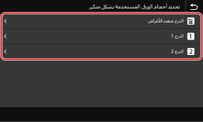 تعرض شاشة إعدادات الورق أحجام الورق المُسجلة التي تُستخدم بشكل متكرر. في حالة عرض أحجام ورق غير مستخدمة، يمكنك إخفاؤها لكل مصدر ورق لتسهيل تحديد حجم الورق.