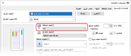 حدد مربع الاختيار [تحجيم لملاءمة حجم الورق]، وفي [حجم ورق الوجهة]، حدد حجم الورق المُراد الطباعة عليه.