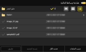لتحديد جميع الملفات المعروضة، اضغط على [تحديد الكل] في الجزء السفلي من الشاشة. في حالة وجود كل من ملفات PDF وملفات الصور (ملفات JPEG أو TIFF)، تُعرض شاشة خاصة بتحديد نوع الملف. استخدم هذه الشاشة لتحديد نوع الملف الذي تريد طباعته.
