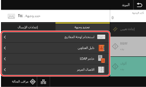 في حالة تقييد الوجهة عند الإرسال بسبب إعدادات المصادقة لوظيفة الإرسال، لا يمكنك تحديد وجهة أخرى. للاطلاع على تفاصيل، اتصل بالمسؤول.