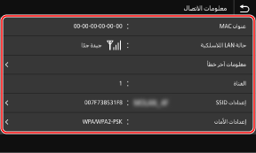 بالإضافة إلى عنوان MAC ومعلومات اتصال شبكة LAN اللاسلكية عندما يكون الجهاز متصلًا بشبكة LAN اللاسلكية، يمكنك أيضًا عرض إعدادات الأمان.