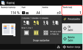 Pritisnite [Število kopij], s številčnimi tipkami vnesite število kopij, nato pa pritisnite [Zapri].