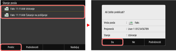Če je prikazan zaslon s seznamom poslov, izberite posel, ki ga želite preklicati, in pritisnite [Preklic]