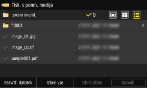 Če želite izbrati vse prikazane datoteke, pritisnite [Izberi vse] na dnu zaslona. Če so na voljo tako datoteke PDF kot tudi slikovne datoteke (datoteke JPEG ali TIFF), je prikazan zaslon za izbiro vrste datoteke. Na tem zaslonu izberite vrsto datoteke, ki jo želite natisniti.