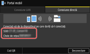 Verificați SSID-ul și cheia de rețea a aparatului, afișate în fila [Conexiune directă].