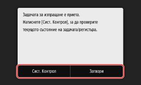 Проверка на състоянието на изпращане и записване и регистрационния файл за сканираните данниПри натискане на [Затвори] се появява екранът за сканиране.