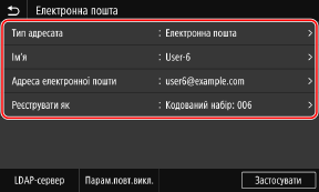 Якщо використовується сервер LDAP, зареєструйте його для пошуку адресатів на апараті. Реєстрація LDAP-серверів |