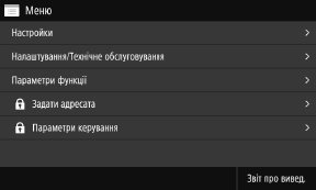 Змінення інтерфейсу екранаВи можете змінити інтерфейс панелі керування, наприклад змінити мову інтерфейсу й одиниці вимірювання та показати чи приховати повідомлення. [Параметри відображення] Можна інвертувати кольори екрана й налаштувати яскравість, щоб полегшити перегляд вмісту екрана. [Спеціальні можливості] Автоматичне очищення параметрівЗа замовчуванням, якщо після певного періоду часу не виконуються жодні операції, буде очищено параметри, які налаштовуються на екрані, і відобразиться екран [Головний]. Можна змінити час, що минає до очищення параметрів, і екран, який відображається після цього. [Час автоматичного скидання] [Функція після авт. скидання] |